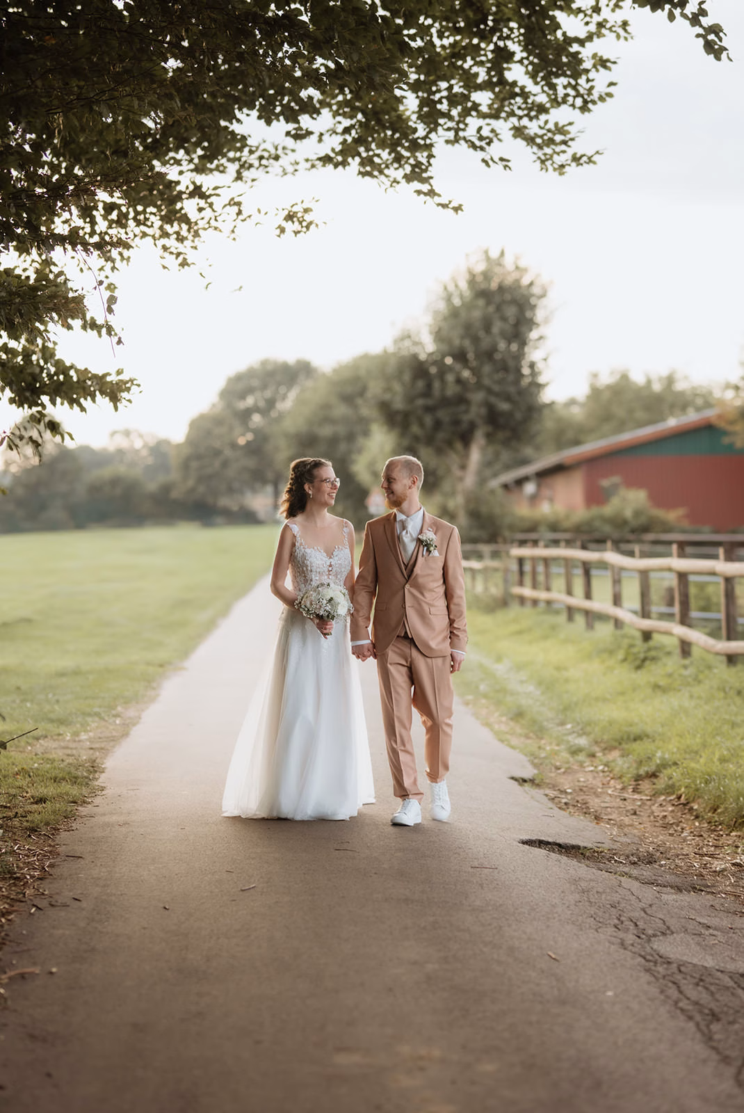 Eines meiner persönlichen Highlights war das Paarshooting bei Sonnenuntergang. Wenn das Licht weicher wird, die Sonne langsam untergeht und für einen kurzen Moment Ruhe einkehrt, entstehen die emotionalsten und natürlichsten Bilder. Carolin und Marcel haben diesen Moment ganz für sich genutzt – ohne Druck, ohne Posen, einfach sie selbst. Genau so entstehen zeitlose Hochzeitsfotos, die nicht nur schön aussehen, sondern sich auch Jahre später noch genauso anfühlen wie dieser eine Moment.