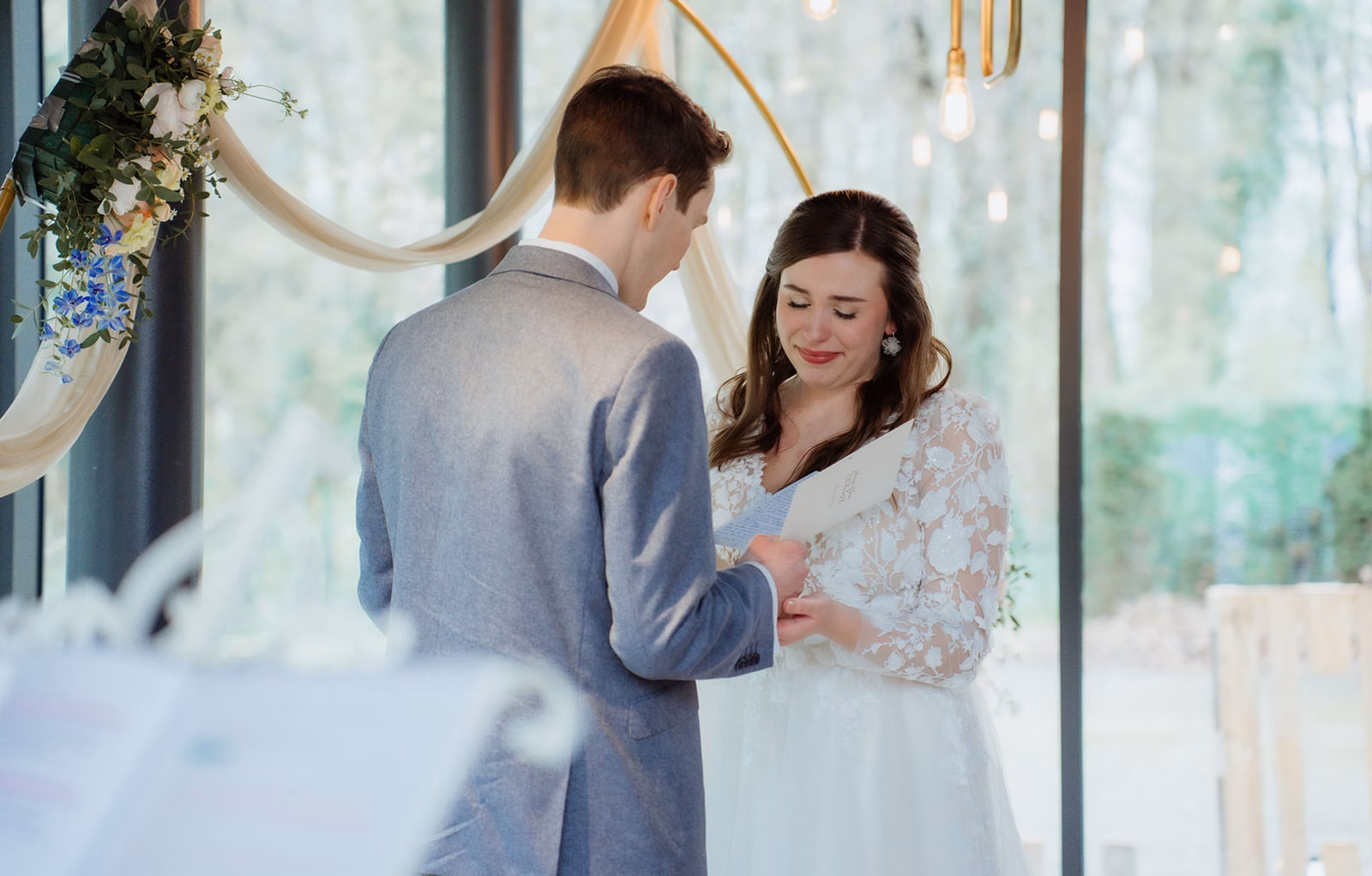 Bevor es zur eigentlichen Trauung ging, entschieden sich Melissa & David für einen First Look draußen im Grünen. Umgeben von Frühlingslicht und ersten zarten Farben der Natur sahen sie sich zum ersten Mal an diesem Tag – ganz für sich, ohne Ablenkung. Das Wetter meinte es unglaublich gut mit den beiden: mild, sonnig und genau richtig für einen entspannten, emotionalen Moment, der voller Vorfreude auf das Kommende war.Im Anschluss folgte die freie Trauung in ihrer Location, gemeinsam mit all den Menschen, die ihnen am wichtigsten sind. Eine freie Trauung bietet so viel Raum für Persönlichkeit und genau das wurde hier spürbar.